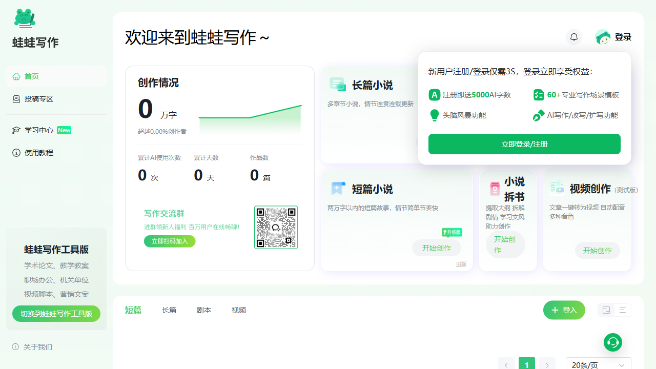 蛙蛙写作(wawawriter.com)是一款面向中文小说、剧本及多场景内容创作者的在线AI写作平台。用户无需下载,微信扫码即可在网页端使用。平台基于自研 Weaver2.0 大模型,提供从灵感激发、大纲生成、正文续写到润色排版的全流程辅助,支持科幻、悬疑、言情等 100+ 题材,并可一键拆书、改编剧本。云端实时保存,多设备同步,免费额度+会员模式兼顾新手与职业作者。