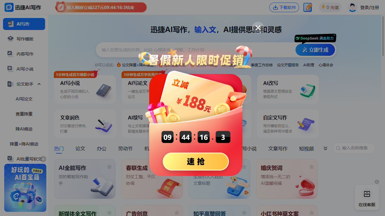 迅捷AI写作(https://www.aichat1234.com/app/)由沪顿科技推出,基于自研NLP大模型与RAG技术,提供从灵感捕捉、大纲生成到终稿润色的“智能创作流水线”。平台覆盖学术、商业、社交媒体等多领域,支持中文及多语言文本、图片、视频文案的识别与生成,适配学生、自媒体、电商、职场人士等群体,帮助用户将碎片化想法快速转化为高质量原创内容。