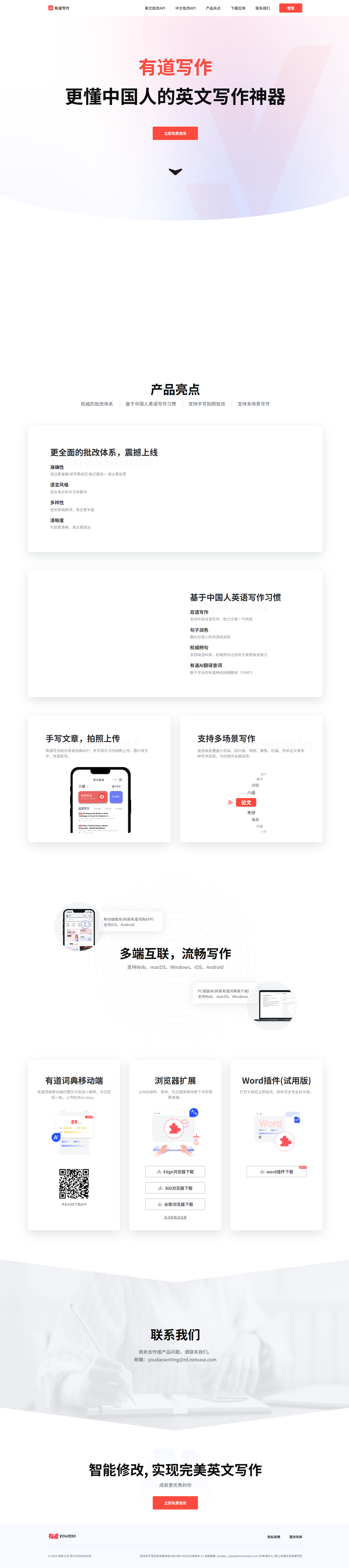 有道写作是网易有道推出的在线英文写作辅助工具,基于中国人英语写作习惯,提供语法纠错、风格润色、模板范例、拍照识别、跨平台同步等服务。覆盖小学到学术论文全场景,支持Web/APP/Word插件多端使用,并与有道云笔记、词典互通,形成“写作-批改-归档”闭环。