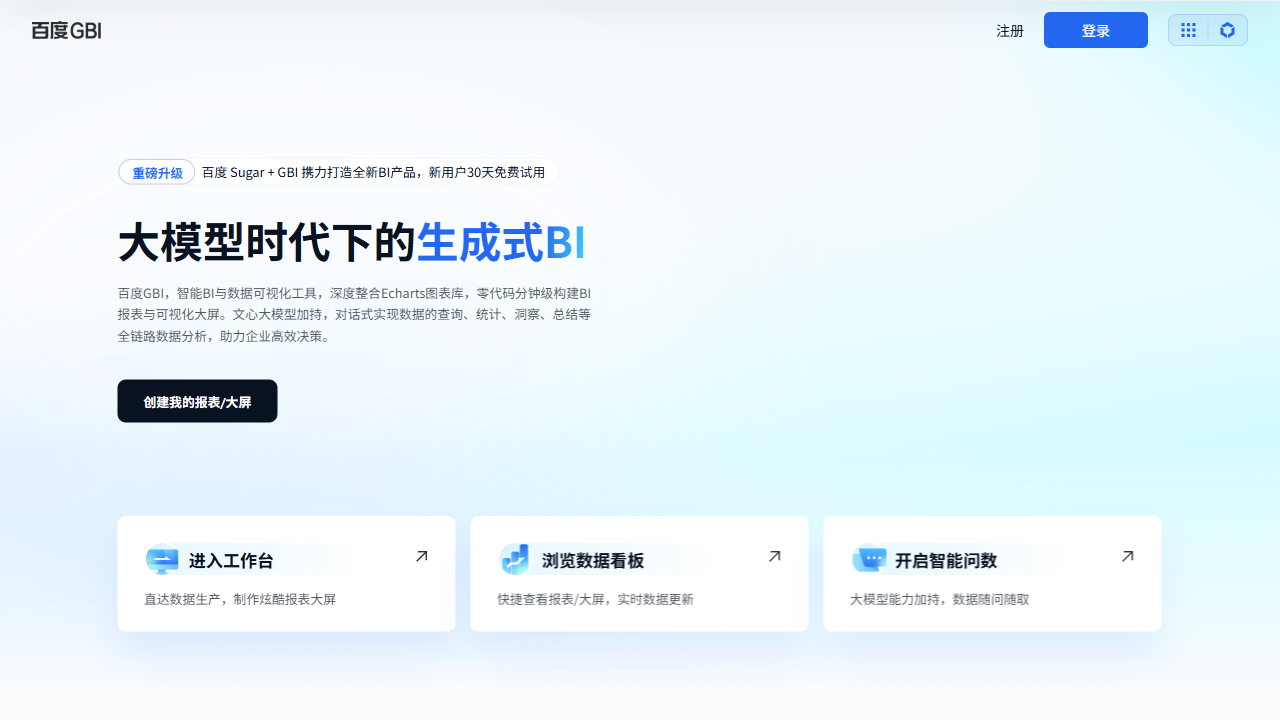 百度GBI(Generative Business Intelligence)是百度智能云推出的生成式商业智能平台,依托文心大模型4.0,将大模型能力与BI深度融合。用户无需SQL或编程,仅通过自然语言对话即可连接Excel、CSV、数据库等多源数据,完成查询、归因、预测、可视化等全链路分析。平台内置行业知识图谱,支持金融、医疗、零售等场景的专业知识注入,实现“任意表,随便问”的零门槛数据洞察,助力企业分钟级决策。