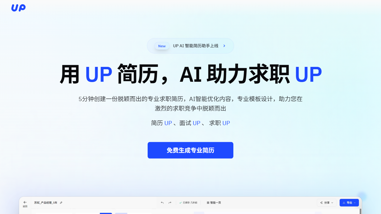 UP简历(upcv.tech)是面向求职者的在线AI简历平台。用户像与HR聊天般回答几个问题,系统即自动生成结构完整、内容专业的简历初稿;再粘贴目标职位JD,AI即刻对齐关键词、量化成果并润色措辞。平台提供海量高颜值模板,拖拽式排版,10秒导出高清PDF,全程免费无水印,帮助应届生与职场新人高效打造高通过率简历。