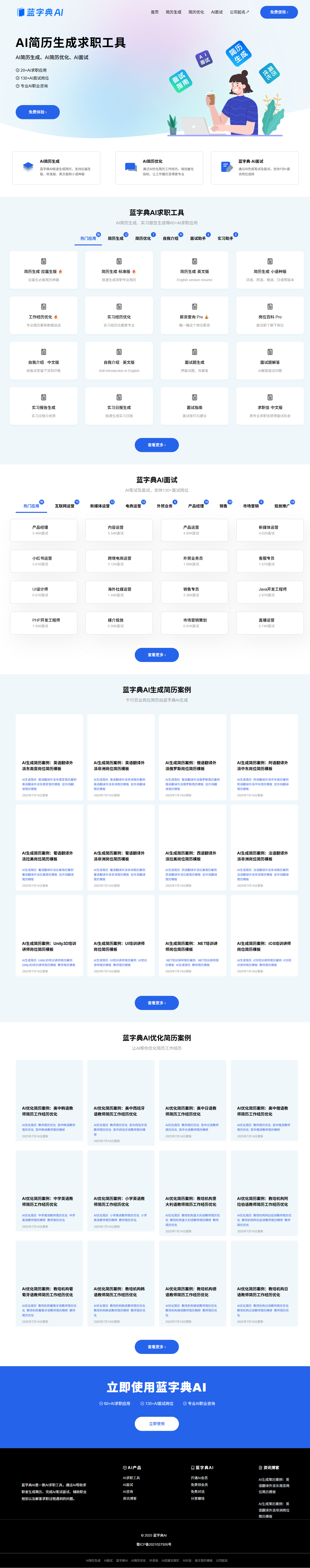 蓝字典AI求职(https://www.lanzidian.com)是面向全球求职者的智能求职平台,依托大模型与岗位大数据,提供“写简历-改简历-练面试-推职位”全链路服务。平台已覆盖互联网、金融、制造等130+热门岗位,支持中文、英语、法语、西语、日语等多语言简历一键生成,并针对应届生、转行者、资深人士提供差异化模板。用户只需输入个人基本信息,AI即可自动匹配岗位关键词、优化措辞、排版设计,3分钟输出专业简历;同时内置真实面试题库与AI面试官,模拟语音/视频面试并给出评分与改进建议,帮助用户快速提升求职成功率。