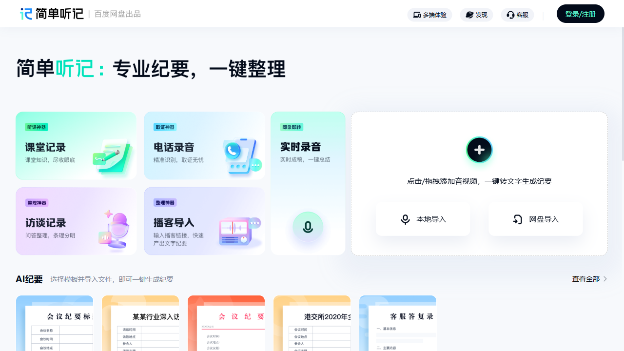 简单听记是百度网盘推出的在线AI语音转写工具,用户无需安装软件,通过浏览器即可上传本地或网盘音频,自动将语音转为文字并生成结构化纪要。平台依托百度自研的语音识别与自然语言处理技术,支持中文、英文等多语种,覆盖会议、课堂、采访等场景,提供逐字稿、智能摘要、模板化排版及在线编辑、导出、分享等一站式服务,帮助个人和企业高效完成音频信息整理与知识沉淀。