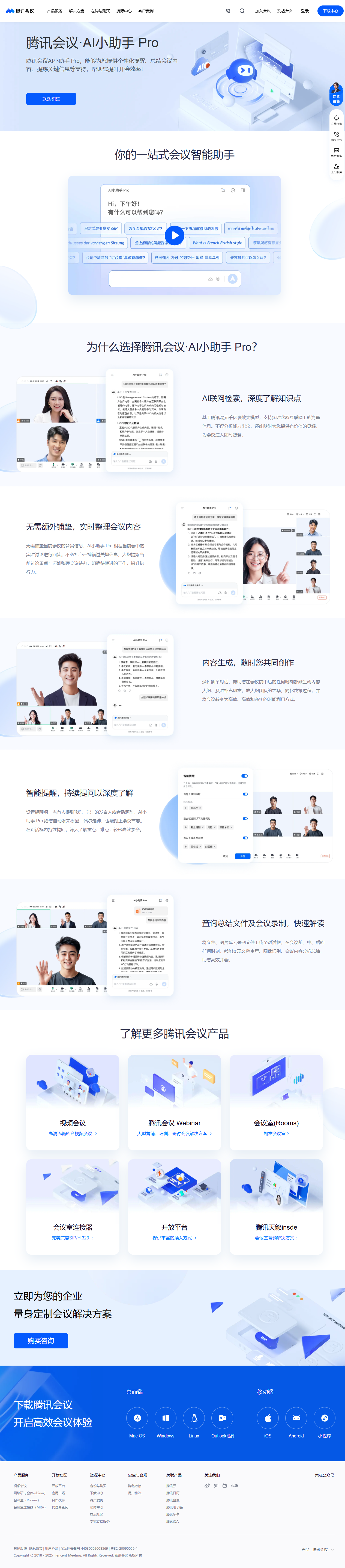 腾讯会议AI小助手基于腾讯混元大模型,嵌入腾讯会议客户端,覆盖会前、会中、会后全链路。它通过自然语言指令,实现实时纪要、要点回顾、待办提取、关键词提醒等功能,帮助用户“听得全、记得快、跟得上”。无需额外安装,登录腾讯会议即可一键唤起,支持Windows、macOS、iOS、Android及微信小程序。
