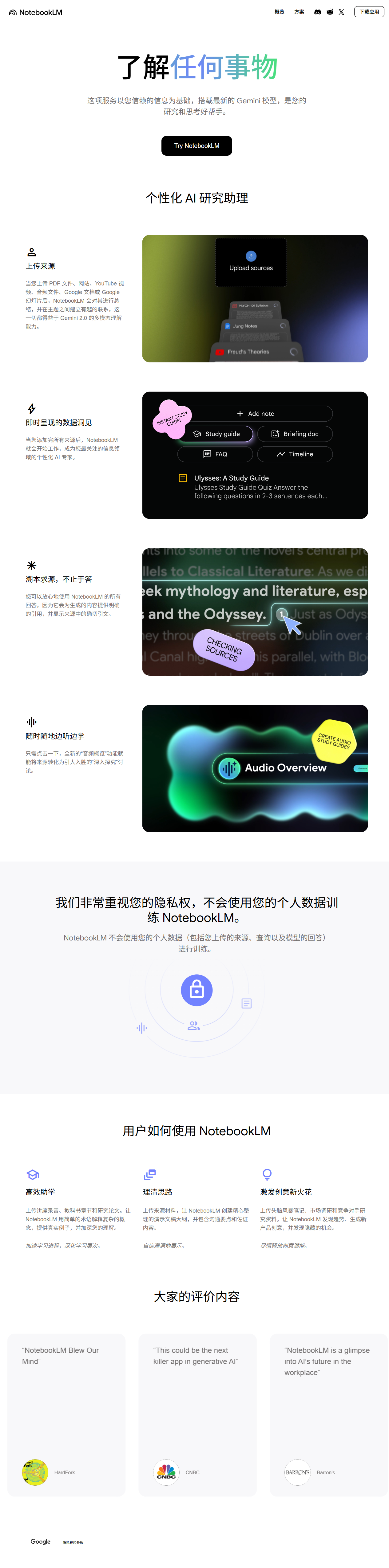 NotebookLM 是 Google Labs 推出的实验性 AI 研究助理,基于 Gemini 大模型。用户把 PDF、网页、Google Docs 等资料拖进“笔记本”,系统即刻生成专属知识库,随后可用自然语言问答、生成摘要、时间线、FAQ 甚至双人播客。所有回答与创意均严格限定在已上传内容,杜绝幻觉。目前全球 200+ 地区免费使用,需 Google 账号登录。
