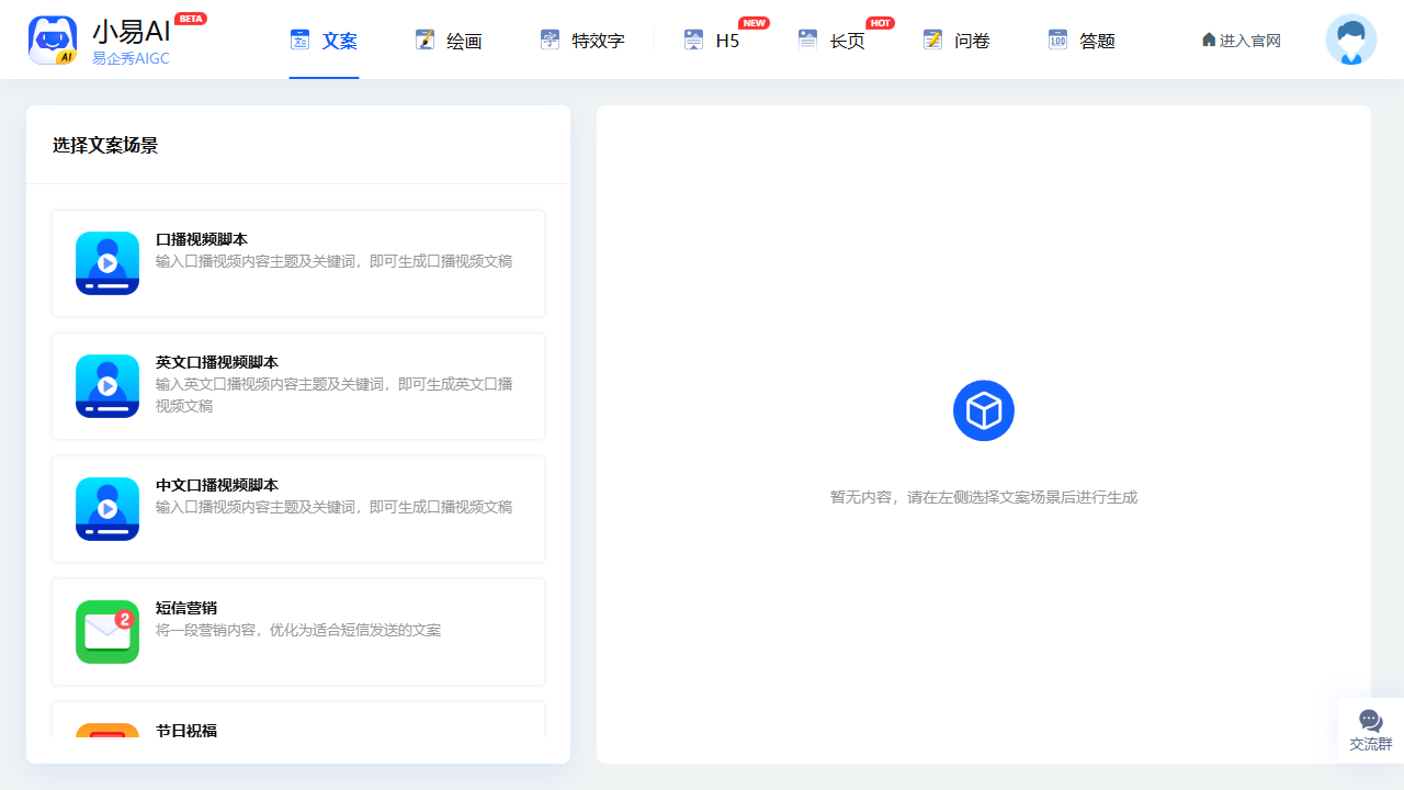 易企秀AI(ai.eqxiu.com)是易企秀旗下专为营销人打造的“零门槛”AI创意平台。依托易企秀8年深耕H5、海报、表单、长页、小程序等模板的积累,平台把AI内容生成、智能排版、品牌视觉规范三大能力封装成“一句话输入→10秒出稿”的工作流。用户无需设计经验,仅需输入活动主题或卖点,系统即可自动生成可商用、可二次编辑的营销素材,并支持一键发布到微信、企业微信、抖音、短信、线下屏等全渠道,实时回收数据。企业版还提供品牌资产管理、团队协作审批、数据看板等闭环功能,帮助市场、运营、销售部门降本增效。