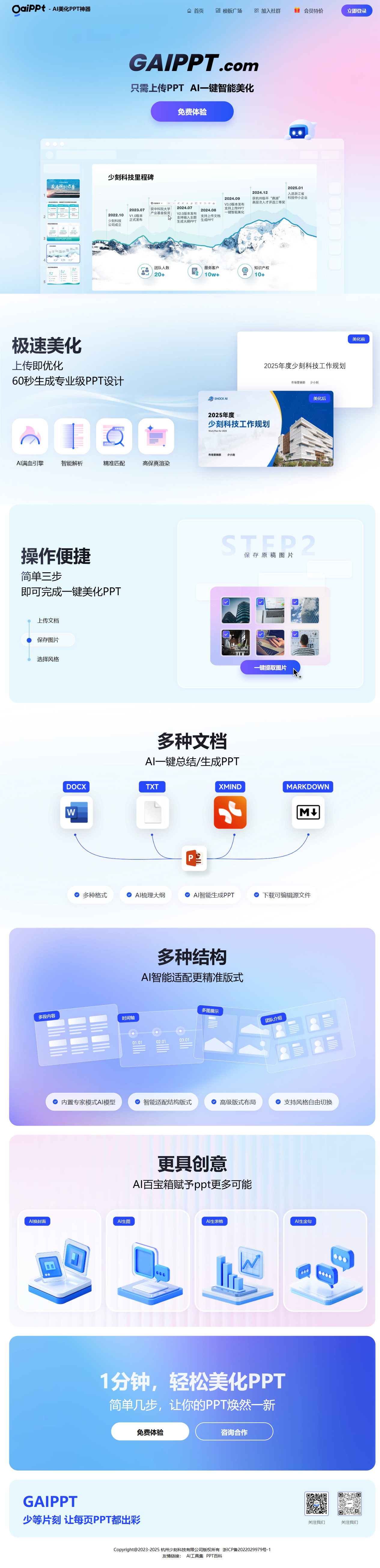 GAIPPT是杭州少刻科技推出的在线AI智能PPT美化平台,基于自研ShockAI排版大模型,可自动解析文本逻辑并匹配最佳版式。用户只需上传PPT/Word/一句话主题,即可在60秒内获得结构化、可视化的专业级幻灯片。平台提供金融、教育、科技等20+行业母版及一键换肤功能,支持云端协作、链接/二维码分享,兼容Windows/Mac/小程序多端使用,让零设计基础的用户也能高效完成商务汇报、教学课件等场景的高质量PPT制作。