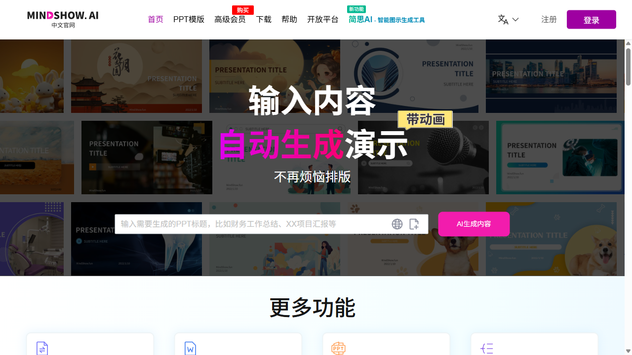 MindShow.fun 是国内领先的 AI 在线演示工具,无需安装软件,打开浏览器即可使用。它通过自然语言处理与视觉设计算法,把“一句话/一段文字/一份文档”自动转换成结构完整、配图精美、动画流畅的 PPT。平台内置 300+ 商务、教育、科技、节日等场景模板,支持中文、英文等多语言输出,并提供云端存储、实时协作、在线演示及 PPTX / PDF / HTML 等多格式导出,帮助用户 3 分钟完成原本需要数小时的演示制作。