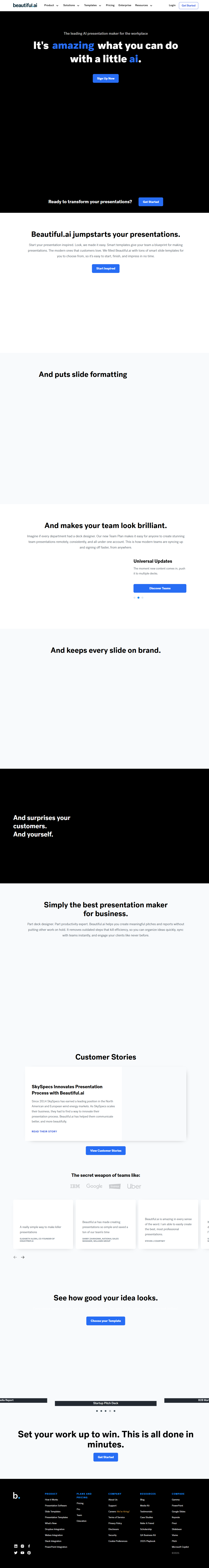 Beautiful.ai 是面向职场人士的在线 AI 演示平台。它把“设计规则”写进算法,用户只需添加文字、图片或数据,系统即刻自动排版、配色、选图、加动画,瞬间生成杂志级幻灯片。平台内置数百套现代模板,覆盖商业、教育、营销等场景,并支持多人实时协作、品牌资产锁定、一键多格式导出。无需设计基础,也能在几分钟内完成专业演示。