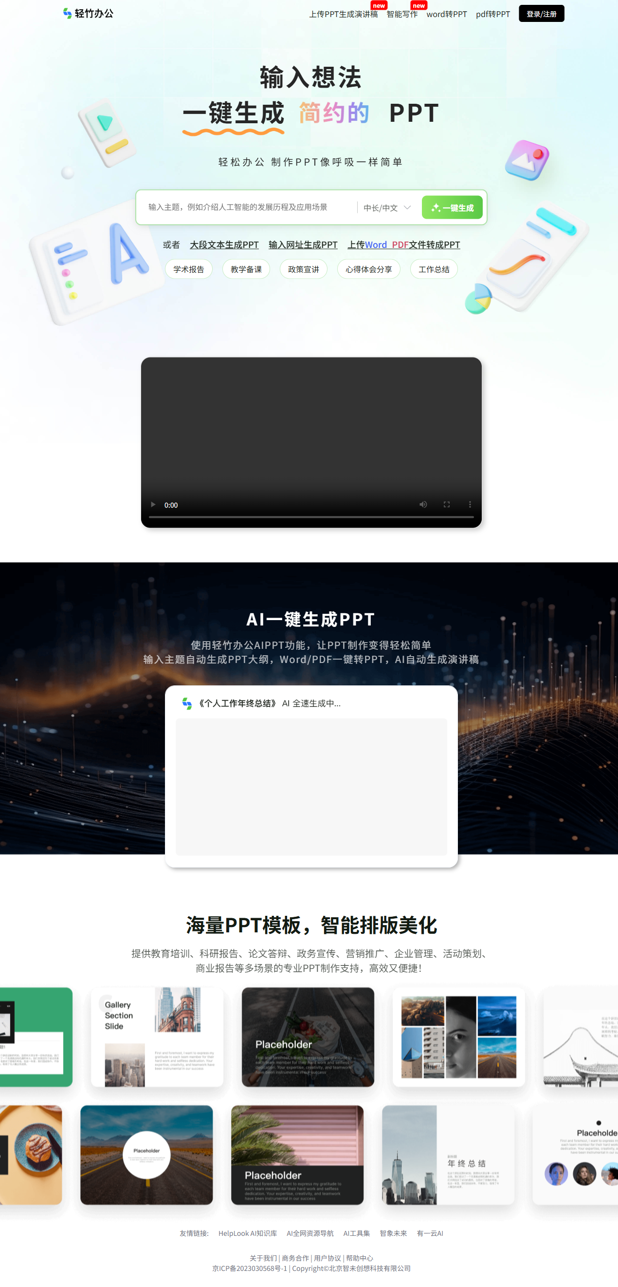 轻竹办公(qzoffice.com)是北京智未创想科技推出的在线AI PPT平台。用户只需输入主题、关键词或上传Word/PDF,系统30秒内即可生成结构完整、设计精美的演示文稿,并支持在线二次编辑、模板一键切换、云端协作及多格式导出。平台内置商务、教育、学术等海量模板与图标素材,覆盖95%职场与教学场景,让“零设计基础”的用户也能3分钟做出专业级PPT。