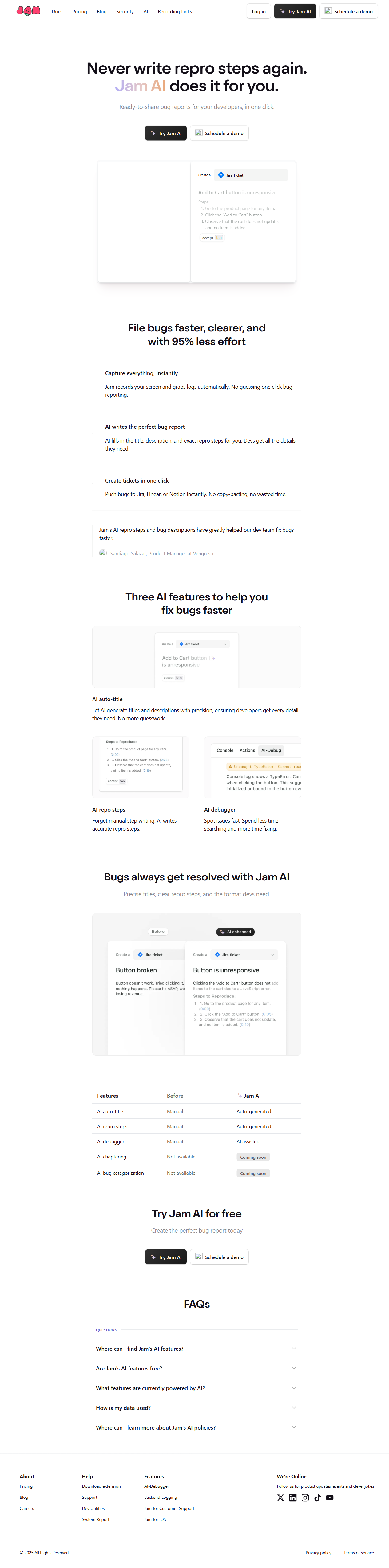 JamGPT 是 Jam.dev 推出的 AI 辅助调试平台,面向前端开发者、测试工程师与产品经理。用户只需将浏览器截图或录屏拖入网页,系统即自动识别页面元素、网络请求、控制台日志等上下文,生成可复现的 Bug 报告,并给出修复建议。它支持与 Jira、GitHub、Slack 等 30+ 工具双向同步,让缺陷从发现到修复全程可视化、可追踪。Jam.dev 团队位于旧金山,产品已被 25 000+ 团队采用,包括 Shopify、Discord、CircleCI 等。