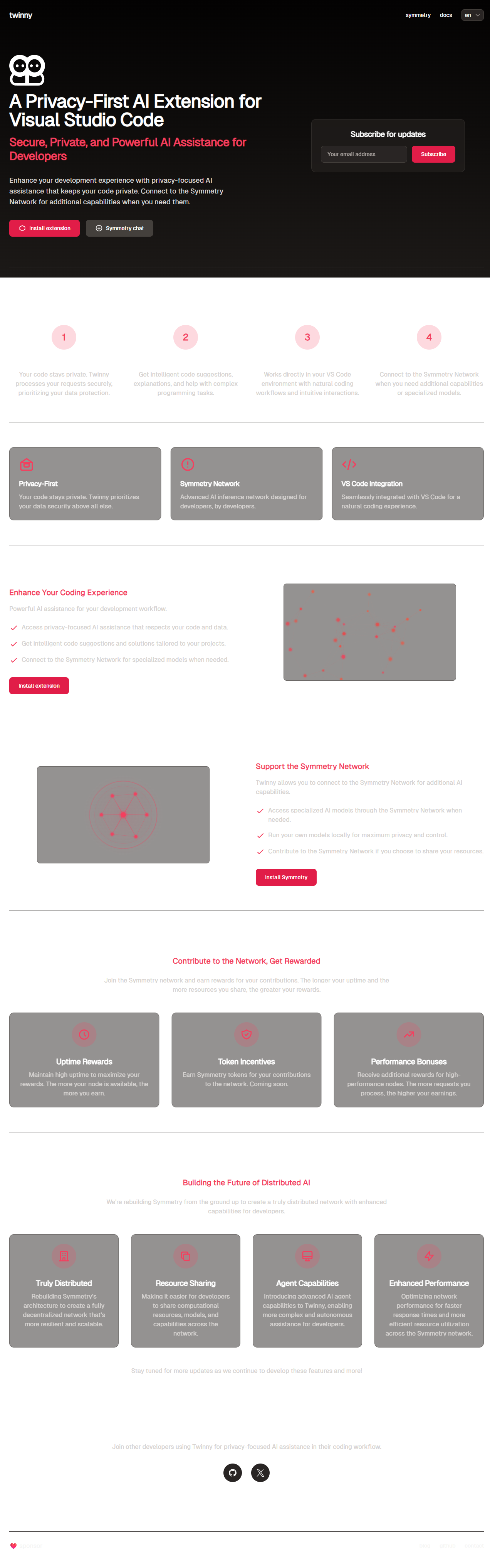 twinny.dev 是 Twinny 插件的官方网站,专为 VS Code 用户打造。它基于本地部署的 Ollama 大模型,提供零费用、零数据外泄的智能代码补全与聊天服务,支持多语言、多模型、离线运行。