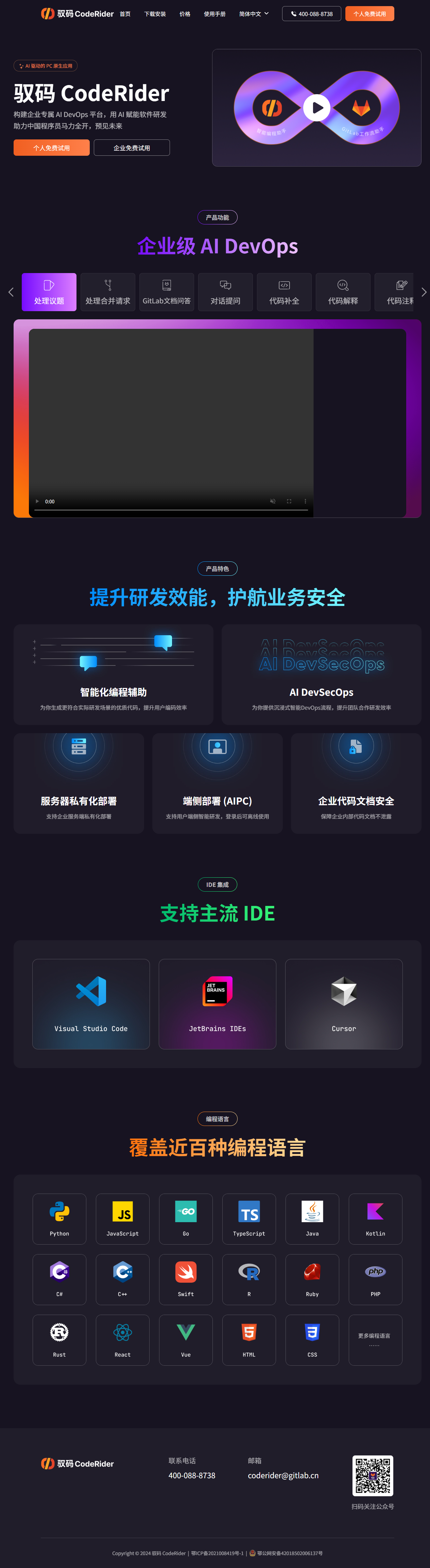 驭码 CodeRider 是极狐 GitLab 推出的企业级 AI 编程与 DevOps 协同平台,集代码补全、生成、解释、单测、注释、优化、问答及智能议题、合并请求、CI/CD 流水线管理于一体。支持 VS Code/JetBrains 全家桶,提供 SaaS 与私有化部署,确保代码不出内网,覆盖近百种语言,帮助开发者从写第一行代码到一键上线,全流程提效。