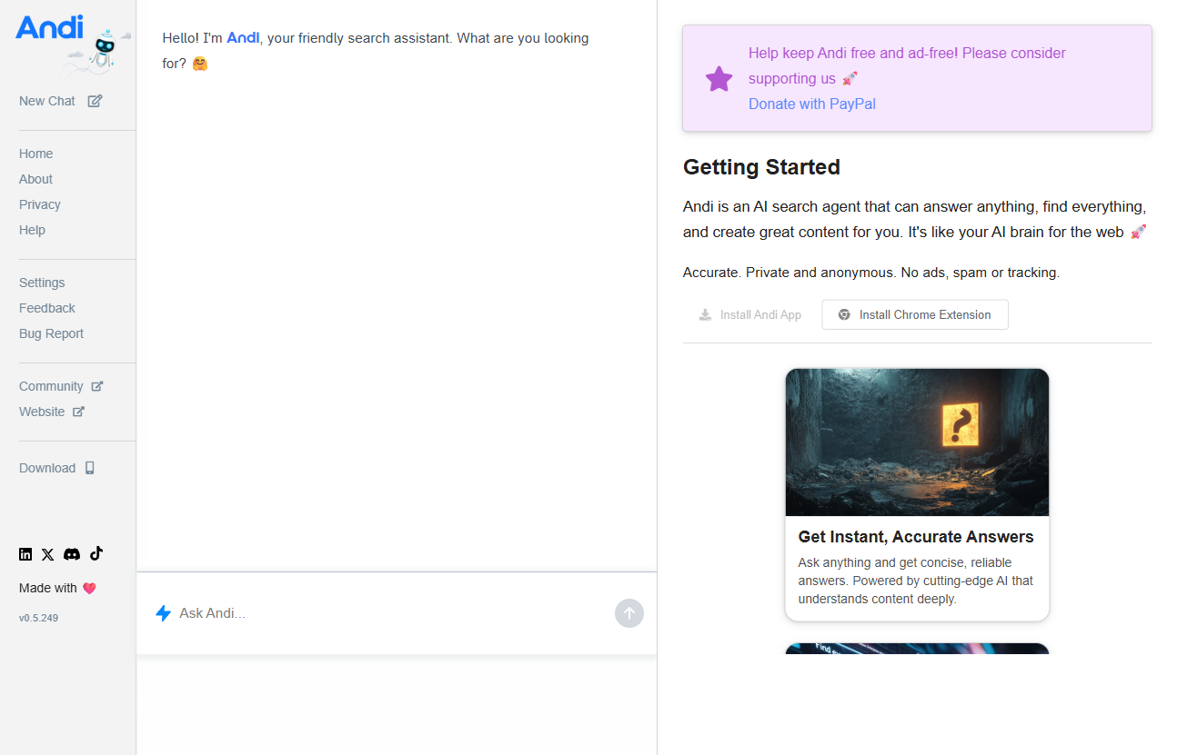 Andi 是面向下一代的生成式 AI 搜索助手,2021 年诞生于 Y Combinator。它打破传统“链接列表”模式,以聊天方式直接给出答案,并实时引用权威来源。整个界面极简,无广告、不追踪用户,支持中文等多语言。Andi 把大语言模型、实时数据与推理引擎结合,先理解问题,再生成简明解释、摘要或步骤指南,像“聪明朋友”一样陪伴搜索。目前免费向全球开放,无需注册即可使用。