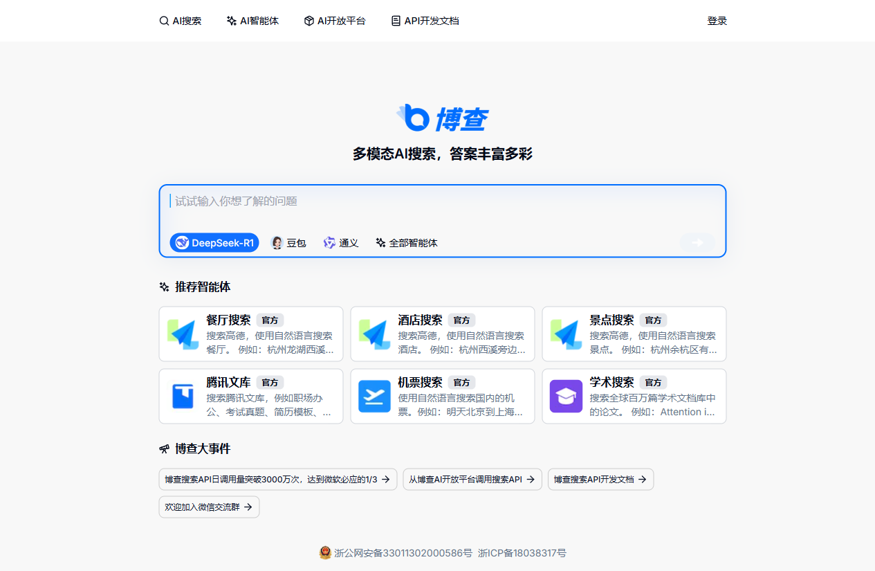 博查AI(bochaai.com)是国内首个面向企业与AI应用的专业搜索平台,由博查团队2024年推出,旨在替代Google、Bing等海外Web Search API。平台聚合近百亿中文网页、字节生态内容(抖音、西瓜视频、今日头条)、学术、百科、机酒、图片、视频等多源数据,通过自研语义重排模型与多模型融合,为LLM、RAG、Agent提供实时、合规、安全、低成本的联网搜索能力。用户无需魔法即可调用RESTful API,支持流式/非流式输出,已获阿里、腾讯、字节等多家头部企业接入。