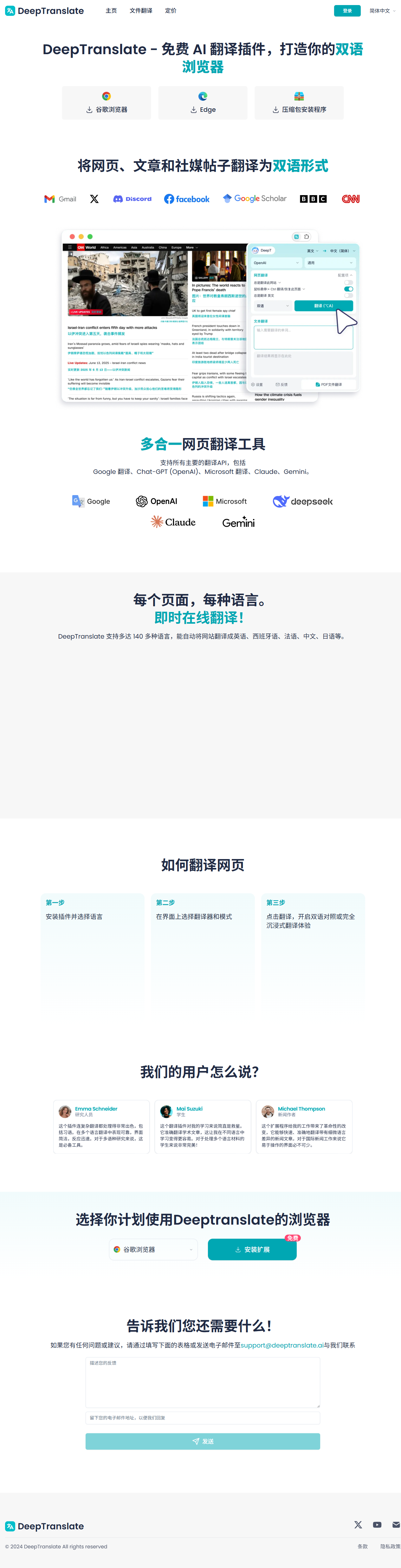 DeepTranslate.ai 是一款面向全球用户的免费 AI 翻译浏览器插件,由金华奇玑电子商务有限公司开发。用户安装后,可在 Chrome、Firefox 等主流浏览器中一键把任意网页转换成中英双语对照或完全沉浸式译文。插件集成 Google、ChatGPT-4o、Microsoft 等多引擎,支持 140 余种语言互译,并保留原文排版。无需注册即可使用,登录 Google 账号还可免费调用 OpenAI 模型,实现更高质量的语境化翻译。