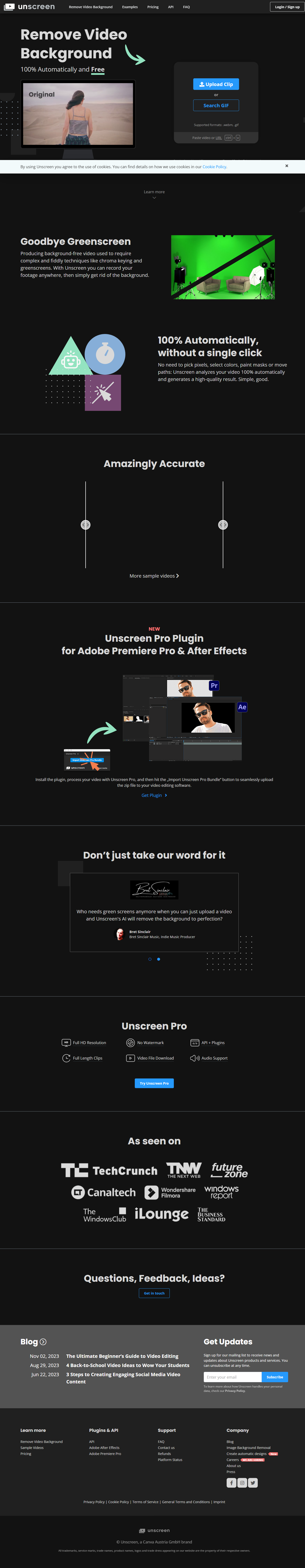 Unscreen 是一家 2020 年上线的在线 AI 抠像平台,由德国创业公司 Kaleido 推出。无需安装软件,上传 MP4、WebM、MOV 或 GIF 等短片,即可在浏览器内 100% 自动移除背景,生成透明或自定义背景的新视频。平台提供免费预览与付费高清下载,并支持 API 接入,方便开发者批量处理。
