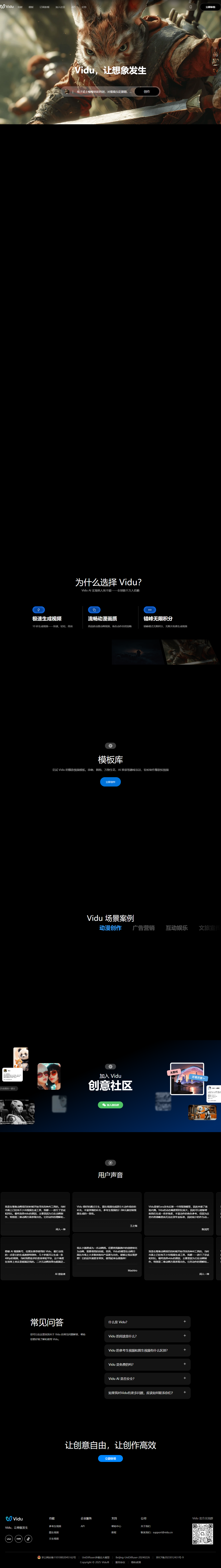 Vidu(https://www.vidu.cn/)由北京生数科技与清华大学联合推出,是中国首个长时长、高一致性、高动态性的AI视频生成大模型。网站提供零门槛在线创作平台,用户无需专业设备,上传图片或输入文字即可在30秒内生成最长16秒、1080P分辨率、电影级多镜头语言的视频。Vidu基于原创U-ViT融合架构,支持写实、动漫、3D卡通等多样风格,并率先上线“参考生”功能,确保角色、场景、道具在整段视频中高度统一,同时提供AI音效、无限量错峰生成及行业最低价格,面向全球创作者开放。