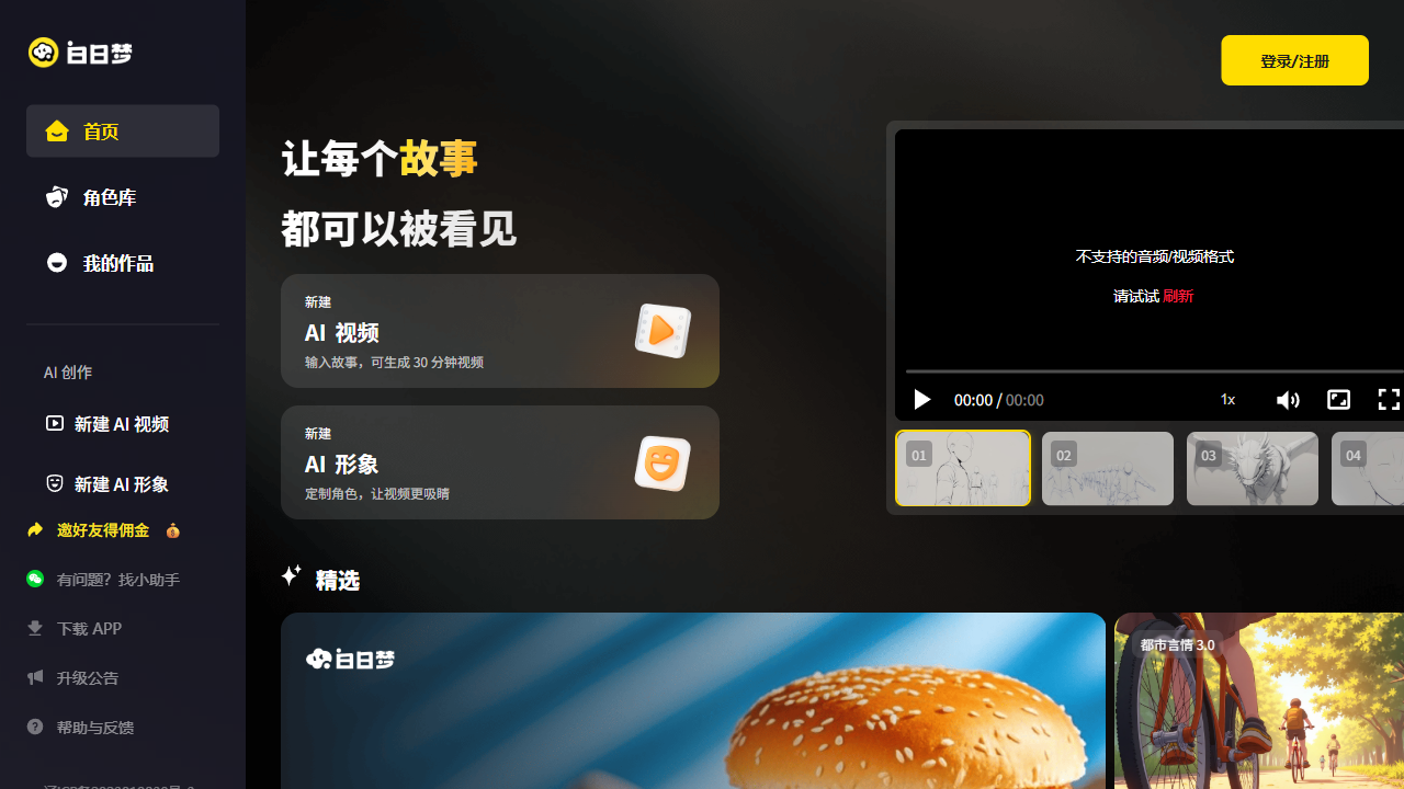 白日梦AI是光魔科技推出的在线视频创作平台,主打“0门槛、0费用、0时长限制”的AI长视频生成。用户只需输入最多2000字文本或上传几张图片,系统即可自动解析角色、场景、分镜,并生成最长6分钟的有声视频。平台内置丰富角色库、配音声线、分镜模板,支持手机端和电脑端同步创作,适合自媒体、教育、广告、小说推文等多场景使用。注册即用,无需下载,所有功能目前全免费开放。
