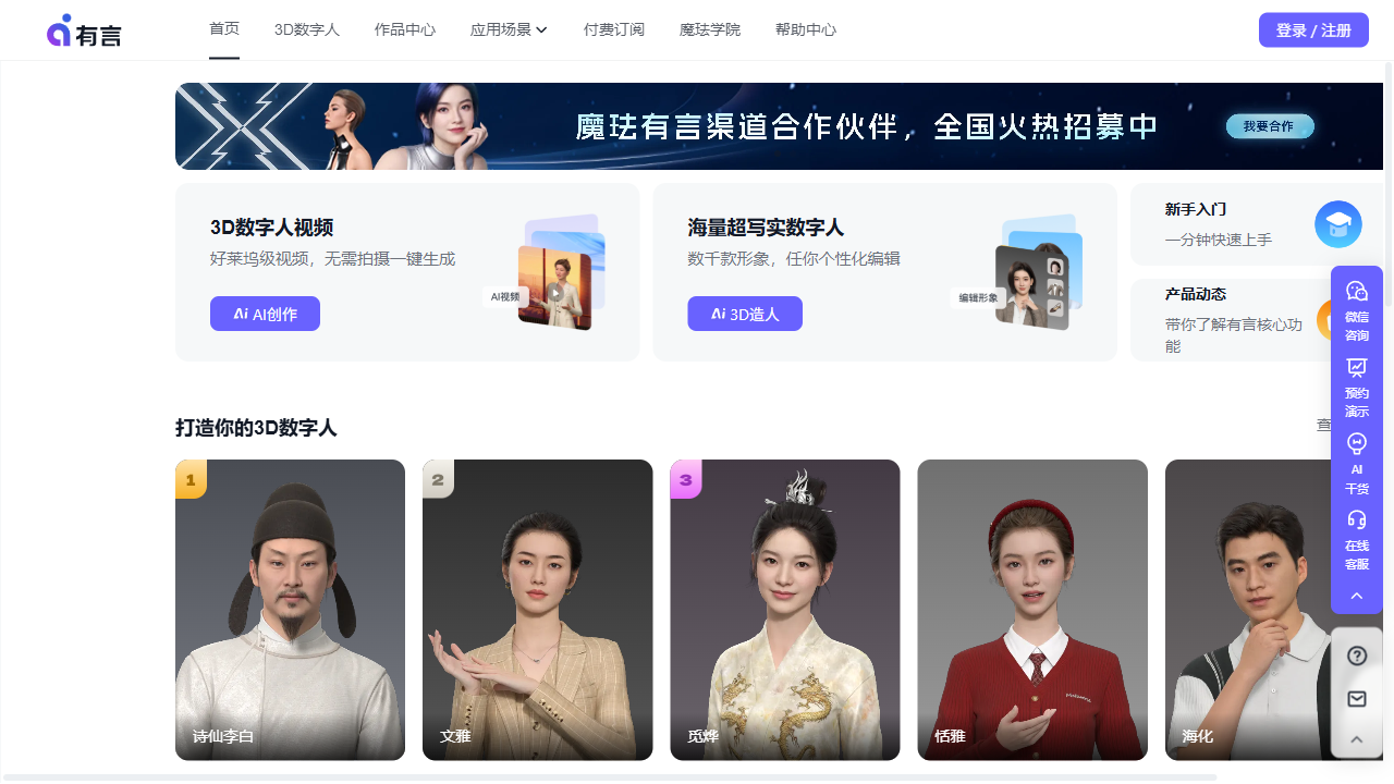 有言3D是一个面向教育、培训、自媒体等行业的在线3D数字人创作平台。用户无需专业拍摄设备,即可在网页端快速创建逼真的虚拟讲师,并自动生成配套PPT、字幕与配音,最终输出横竖屏高清视频。平台提供丰富的3D人物、场景、动作模板,支持上传自有PPT、图片、视频等素材,通过AI驱动口型、表情与肢体动作,实现“人+内容”同步呈现。注册即用,云端渲染,下载即用,极大降低视频制作门槛。
